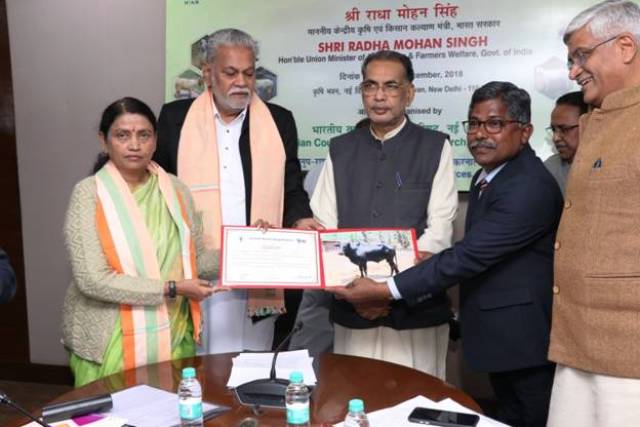 The ICAR has approved registration of record 15 new breeds of livestock and poultry this year alone taking the total to 40 during 2014-18, Union Minister of Agriculture and Farmers’ Welfare Shri Radha Mohan Singh at a ceremony for awarding breed registration certificates to the stakeholders today said that the 15 newly registered breeds include Two cattle breeds - Ladakhi (J&K) and Konkan Kapila (Maharashtra & Goa); Three buffalo breeds - Luit (Assam & Manipur), Bargur (Tamil Nadu), Chhattisgarhi (Chhattisgarh); One sheep breed – Panchali (Gujarat); six goat breeds – Kahmi (Gujarat), Rohilkhandi (UP), Assam Hill (Assam & Meghalaya), Bidri (Karnataka), Nandidurga (Karnataka), Bhakarwali (J&K); One pig breed –Ghurrah (UP); One donkey breed – Halari (Gujarat) and one chicken breed –Uttara (Uttarakhand).