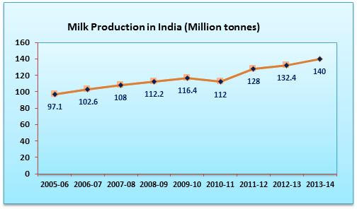 India continues to be the largest producer of milk in world. As a result of several measures to increase the productivity of livestock, milk production has significantly increased by about 25 % from the level of 102.6 million tonnes at the end of the tenth plan to 127.9 million tonnes at the end of the eleventh plan in 2011-12.