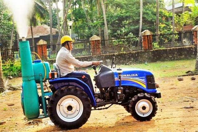 Mr. Chowdappa informed that the blower could be fitted to a 22-25 horse power garden tractor or a mini tractor. When the tractor is driven, the blower mounted on the rear of the vehicle sprayed the solution from the plastic tank fitted on it.