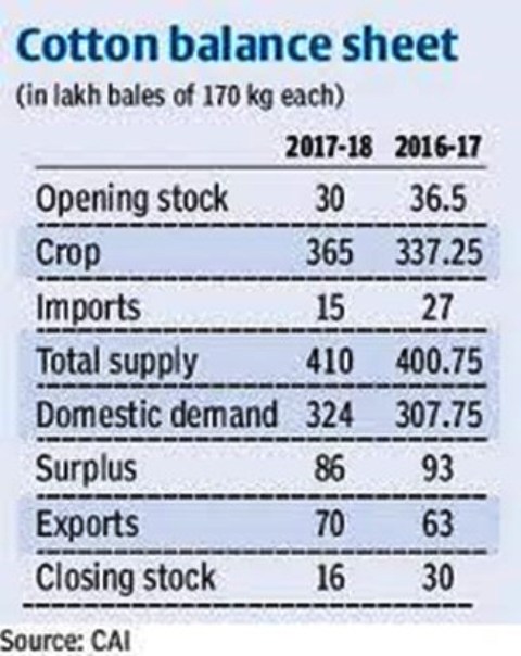 India is the world's largest cotton producer and second-largest exporter. Gujarat, Karnataka, Andhra Pradesh, Madhya Pradesh and Tamil Nadu are the main cotton-growing states. The industry body has revised upward the country's cotton output by five lakh bales to 36.5 million bales for the 2017-18 marketing year taking into account higher yields.