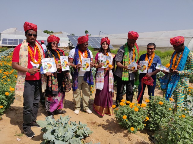 On the other hand, RotoSol, company whose motto is Water from the Sun arranged a demonstration of their Pumps in the fields of Shri Khema Ram Choudhary of village Ghuda Kumawatan with the help of the National institute of Solar Energy, who invited 16 African delegates at Renewable Energy Capacity Building Programme for Indian African Forum Summit, Batch-III to see the live demonstration of the solar pumps working in the fields of the Khema Ram, who got subsidized polyhouse and the solar panels from the Rajasthan Government.