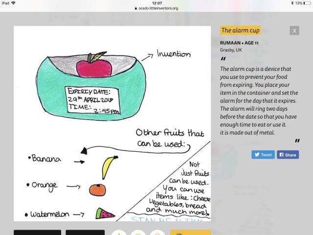 Her fruit bowl, named the 'Alarm Cup', has been crowned the winner of the Ocado Food Waste Challenge with Little Inventors. The device, which features a mini touchscreen display with icons for different produce, alerts its owner two days before its contents are about to expire.