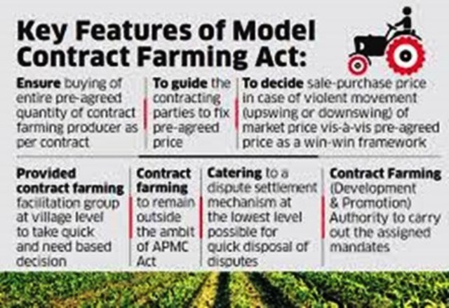 With a view to integrate farmers with bulk purchasers including exporters, agro-industries etc. for better price realization through mitigation of market and price risks to the farmers and ensuring smooth agro raw material supply to the agro industries, Union Finance Minister in the budget for 2017-18 announced preparation of a “Model Contract Farming Act” and circulation of the same to the States for its adoption. Farmer’s producer organizations (FPO’s) have a major role in promoting Contract Farming and Services Contract. On behalf of famers they can enter into agreement with the sponsor.