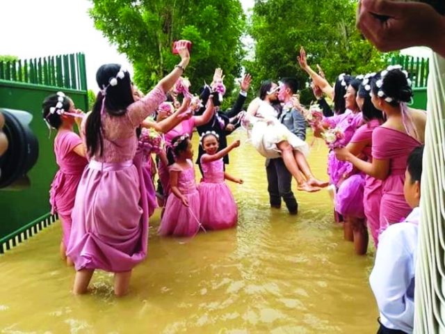 Members of the wedding entourage cheer for newly-wedded couple Simeon and Glory Llorente amid flooding in Barangay Jagnaya, Jamindan, Capiz. Roxas City in Philippine.
