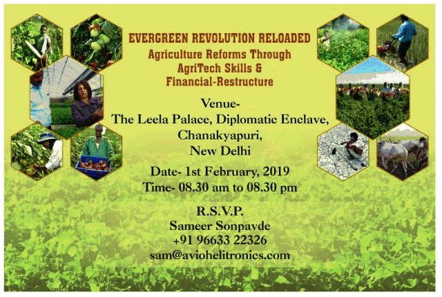 An event on ‘Evergreen Revolution Reloaded: Agriculture Reforms Through Agritech Skills & Financial – Restructure’ will be held on 1st February 2019, at Hotel Leela, Chanakya Puri, New Delhi. The event will begin early by 08:30 am to help speakers or audience beat traffic in the city.