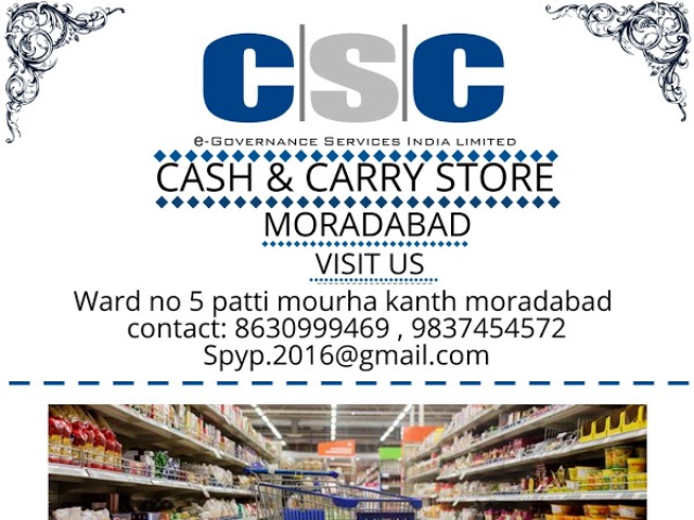 CSC has also launched its first Cash and Carry store in Kanth Tehsil of Moradabad district. This step is seen as to promote rural marketing and create employment in Uttar Pradesh. Efforts are taken to have one cash and carry store in every block. Currently, the store has products of Godrej, Patanjali, JIVA, Crompton, i-Ball. The store also offers free membership benefits to other CSC VLEs and government employees.