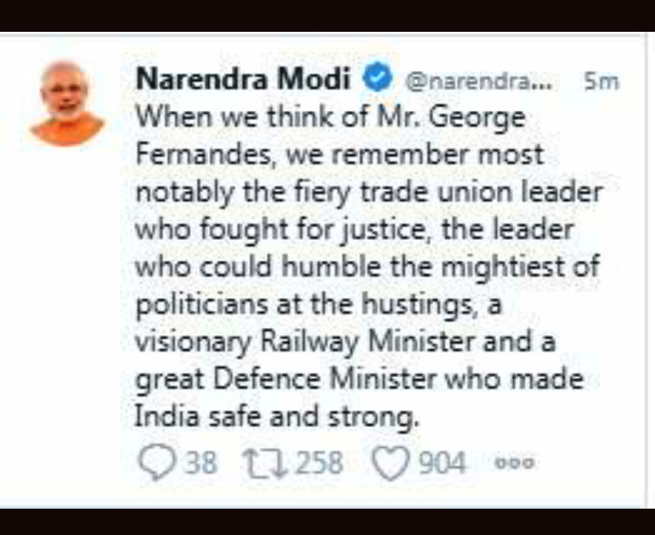 Prime Minister Narendra Modi tweeted, “George Sahab represented the best of India’s political leadership. Frank and fearless, forthright and farsighted, he made a valuable contribution to our country. He was among the most effective voices for the rights of the poor and marginalized. Saddened by his passing away.”