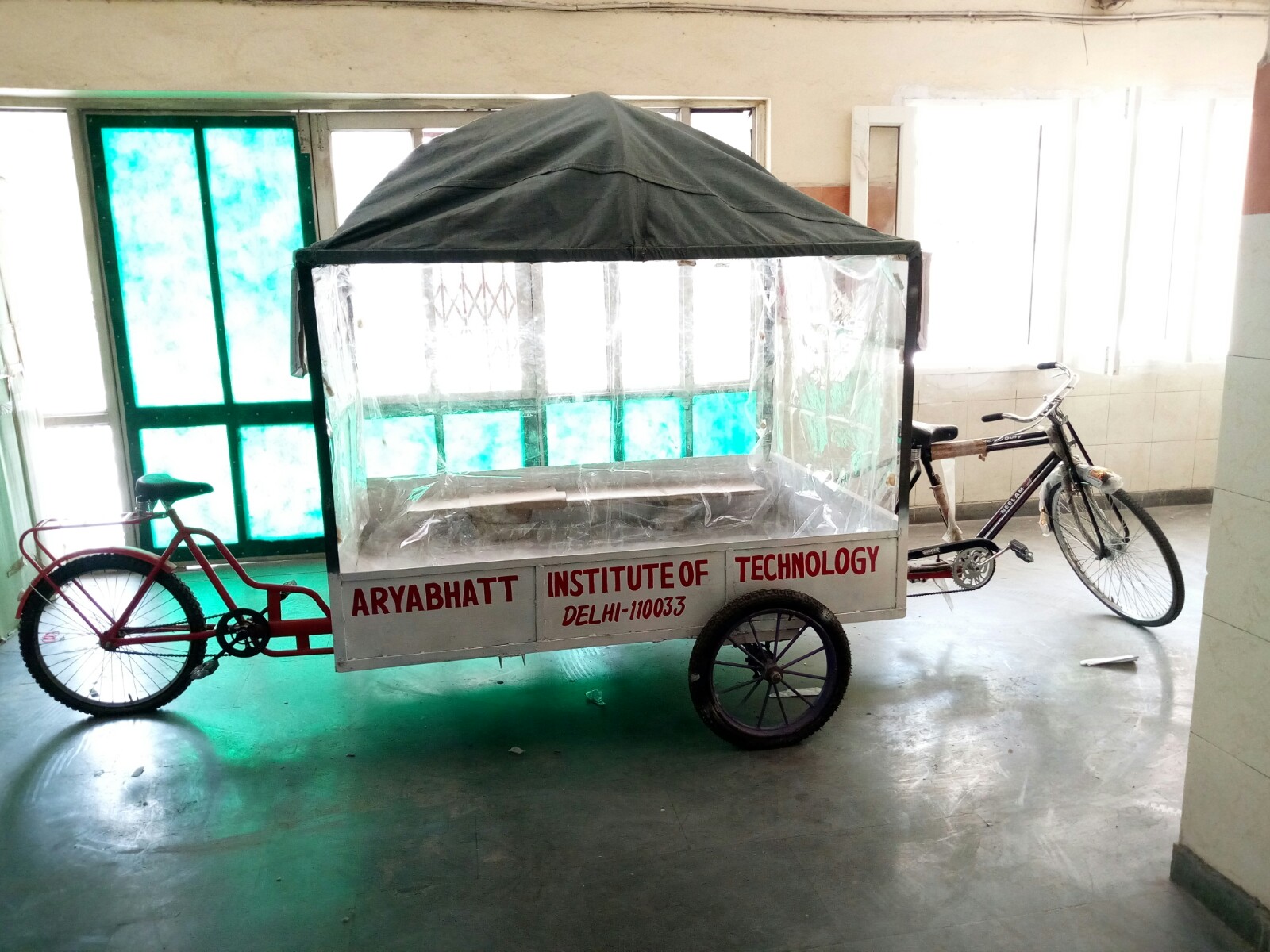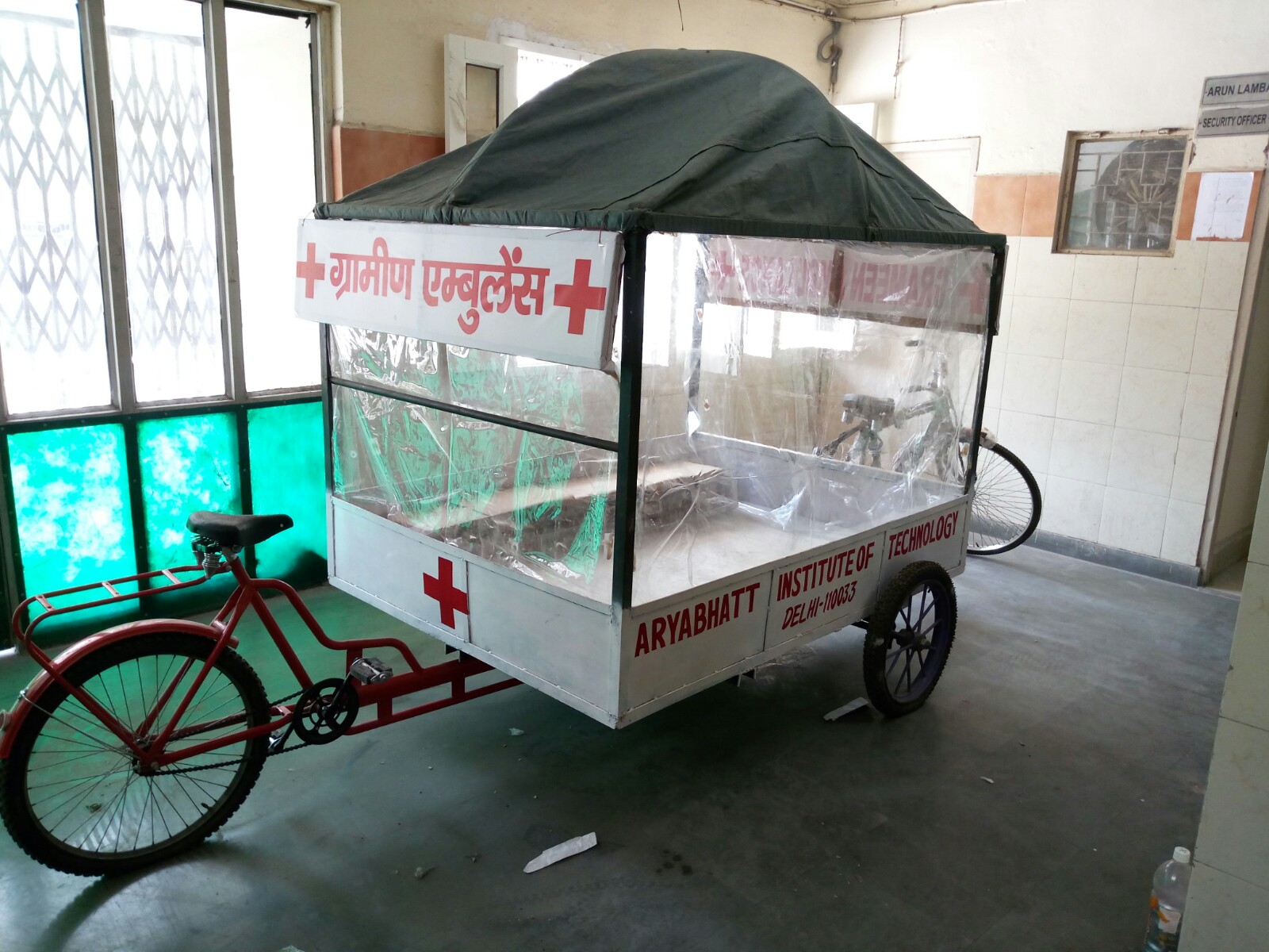 The idea of manufacturing a human-pedaled cycle rickshaw ambulance named as “Grameen Ambulance” thus came into the picture. A few mech engs. diploma students of Aryabhatt Institute of Technology, (Govt of Delhi), took a special challenge, to innovate a new transport facility for rural patients and dead bodies at occasions.