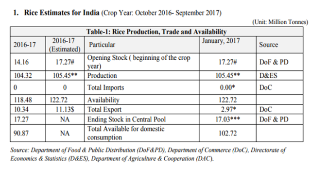 Rice is one of the chief grains of India. Moreover, this country has the largest area under rice cultivation, as it is one of the principal food crops. It is in fact the dominant crop of the country.India is one of the leading producers of this crop. Rice is the basic food crop and being a tropical plant, it flourishes comfortably in hot and humid climate. Rice is mainly grown in rain fed areas that receive heavy annual rainfall. That is why it is fundamentally a kharif crop in India. It demands temperature of around 25 degree Celsius and above and rainfall of more than 100 cm. Rice is also grown through irrigation in those areas that receives comparatively less rainfall. Rice is the staple food of eastern and southern parts of India. In 2009-10, total rice production in India amounted to 89.13 million tonnes, which was much less than production of previous year, 99.18 million tonnes. The Rice Production Estimate upto September 2017 is given below: