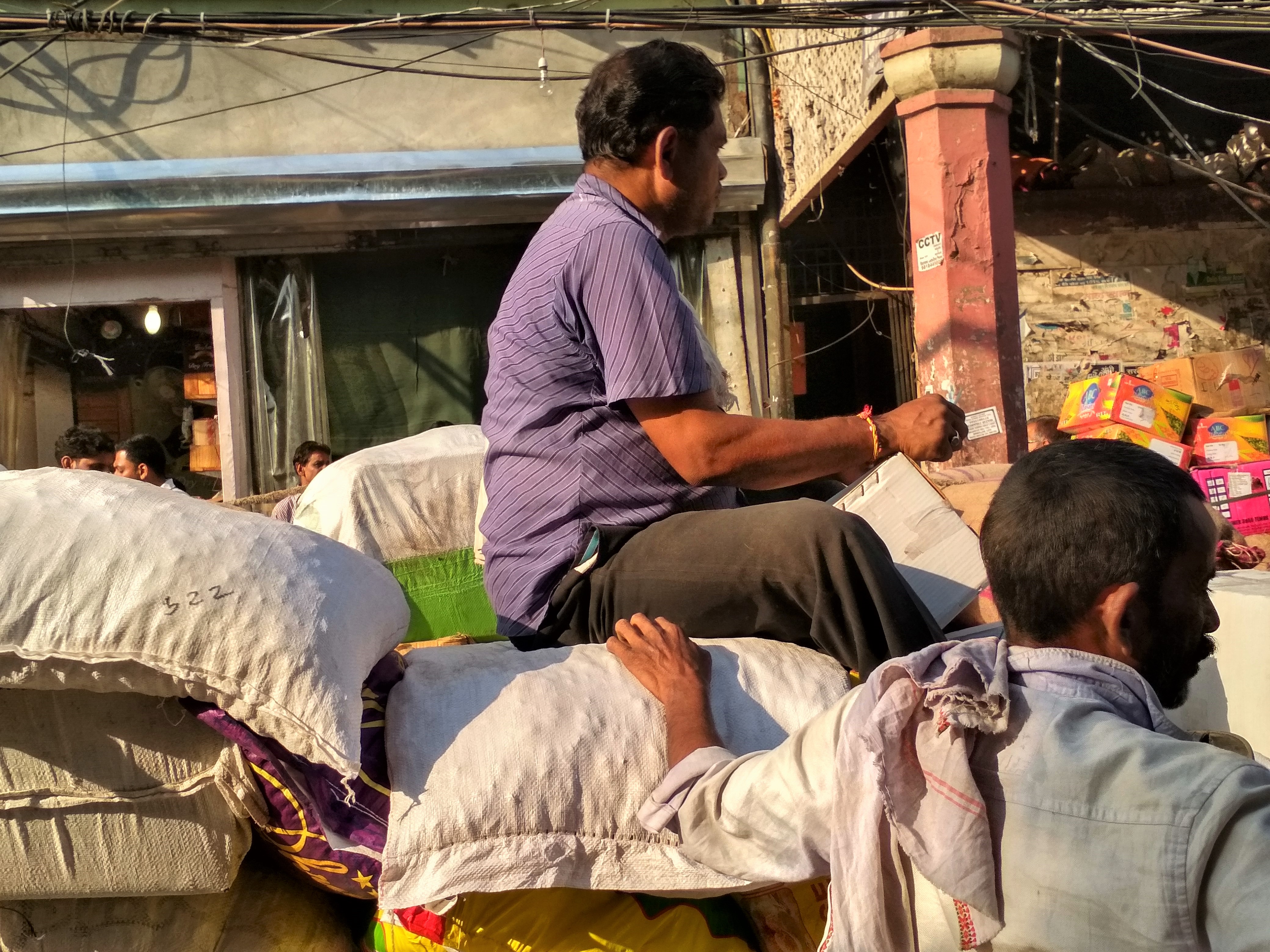 The man finds a non-disturbing space for counting and cross-checking the no. of sacks delivered.