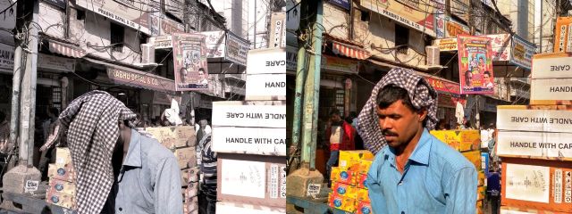 With heavy eyes and a heavy heart, Babuji carries sacks of