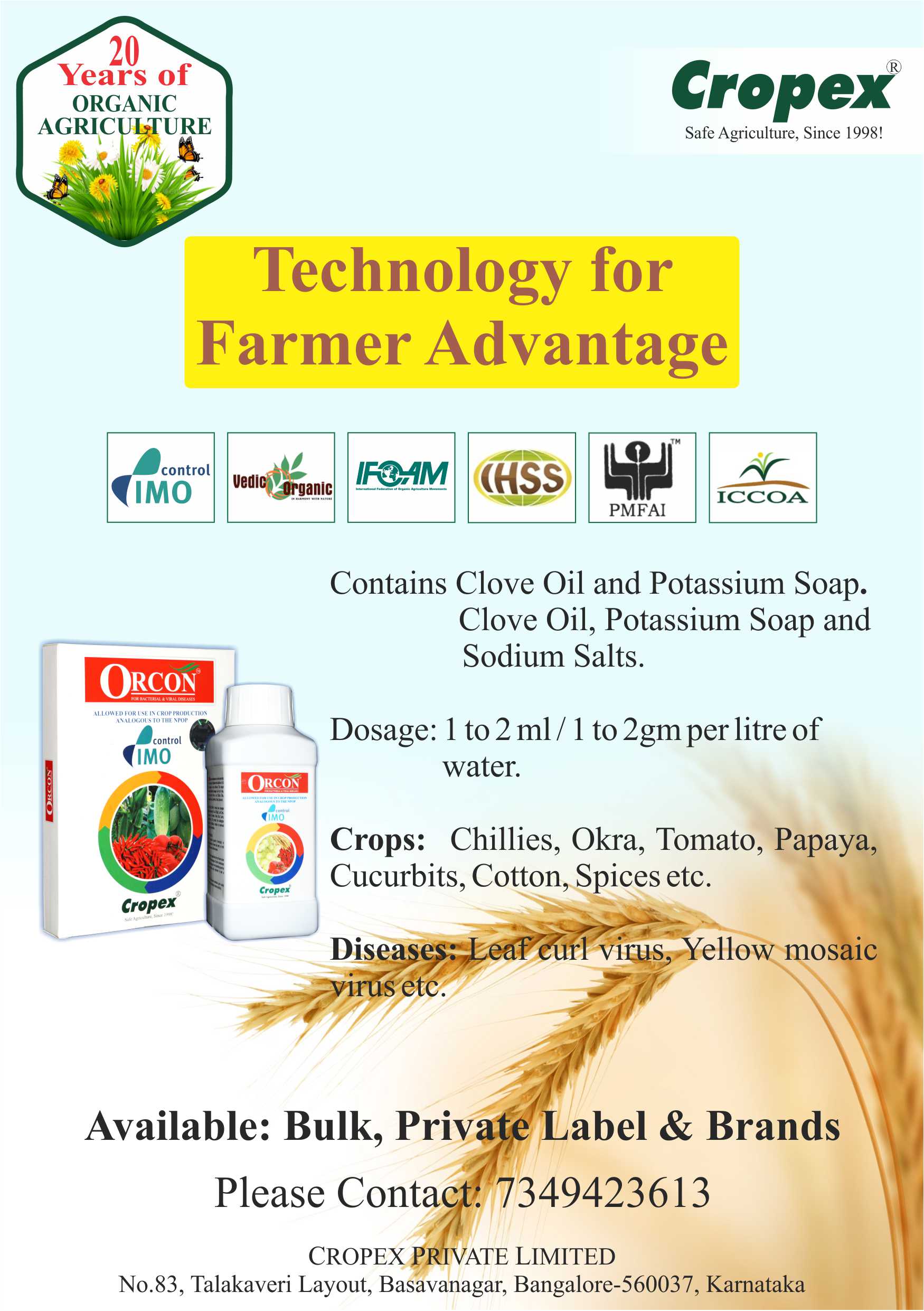 Among the series of number of products is ‘ORCON’, which contains clove oil, Potassium soap and sodium, salts specially for crops like Chillies, Okra, Tomato, Papaya, Cucurbits, Cotton, and Spices etc. It can be applied in dosage of 1 to 2ml/ 1 to 2 gm/ liter of water for the treatment of diseases like Leaf curl virus and yellow mosaic virus and many others related to different crops. It is an organic powder/ liquid, which outperforms chemical bactericides and virucides. It is available in bulk, private label and brands.