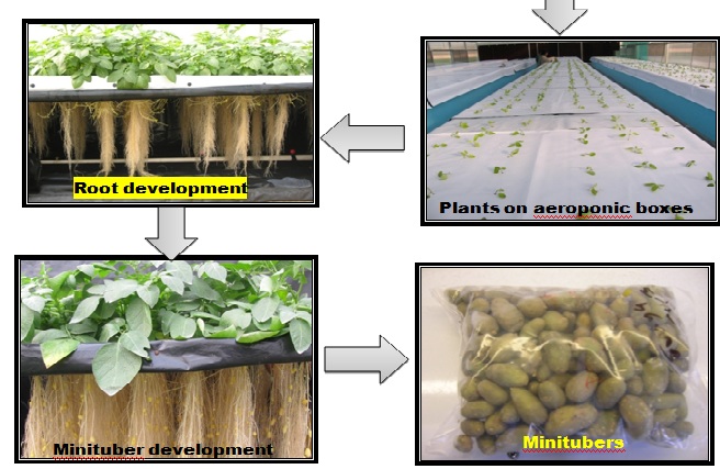 Conventional techniques of seed production, involves the use of potatoes that are propagated by harvesting and replanting the tuber in the field, is routinely used by farmers. Although the method is suitable for small scale farmers, it has several disadvantages like disease and pest infestation, labor intensive, time and weather dependent, low yield (8 tubers per plant per growing season), and high land requirement, if seed produced at commercial level. Tissue culture technique, another method of seed production is poorly adopted by farmers due to several reasons, and has limited to production of disease and virus free initial plant material.