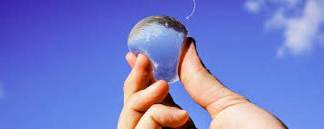 The edible water bottle is a blob-like water container made from sodium alginate gel. The biodegradable blob was created by Skipping Rocks Lab in an attempt to make a more environmentally friendly alternative to single-serving plastic bottles. The container, named "Ooho" by its creators, encloses a small volume of water in a membrane made from brown algae and calcium chloride. The manufacturing process is covered under a Creative Commons license, making the recipe freely distributed and readily available for anyone to use.