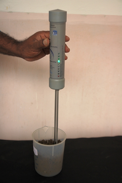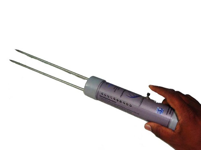 Then, place in the SMI vertically depending on the root zone of the crop. Press the switch and hold it till the Led light stops on a particular coloured Led depending on the moisture status.